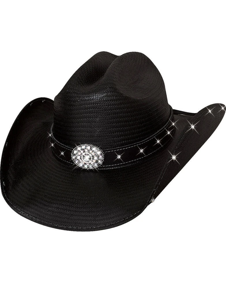 This blinged out hat from Bullhide is a must-have for the stylish cowgirl! It features quality, Shantung Panama straw construction with sleek, black coloring and crystal rhinestone embellishments under the brim and along the band for stand-out style. Turn heads in this premium cowgirl hat from Bullhide!