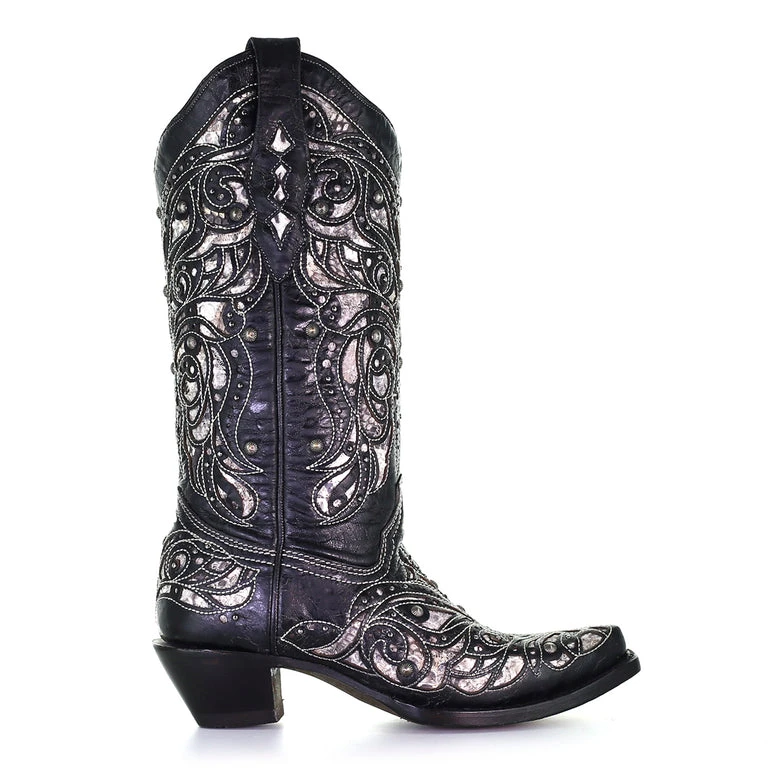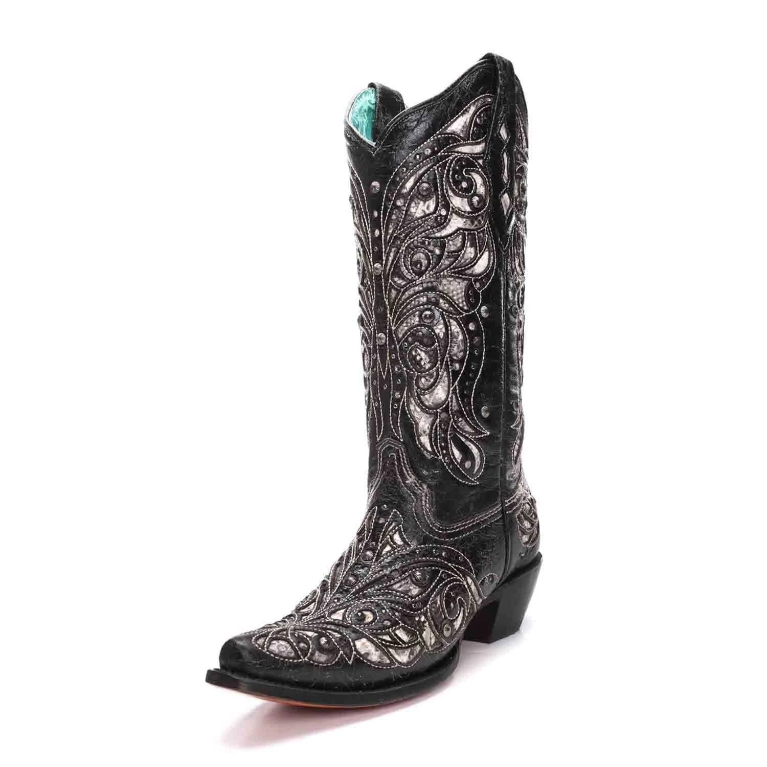 So stylish! Bring some exotic sparkle into your waredrobe with this black python inlay boot from Corral. This pair of women’s cowboy boots is vintage black, adorned with silver studs. The inlay has naturally colored python leather. Snip toe boots in black with a scalloped collar, a 2” fashion heel, and leather sole.