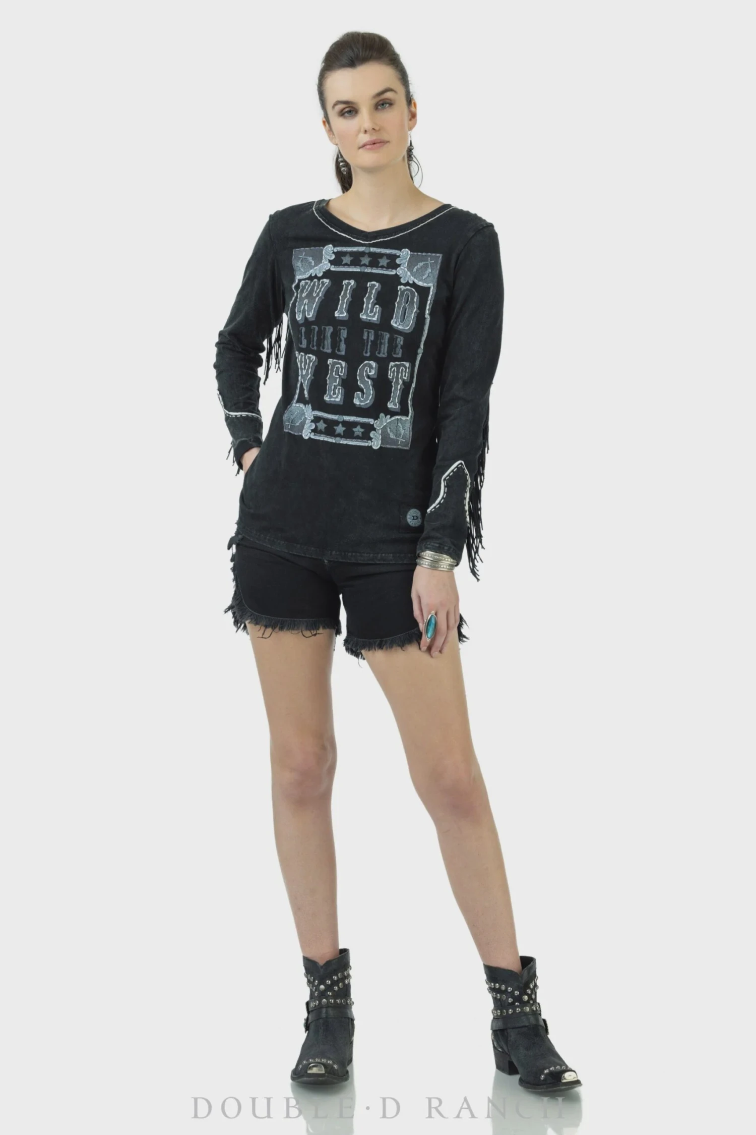 This tee is made to outfit the outlaw in us all. The casual cotton top levels up your long-sleeved tee with some crisp contrast stitching, a bold “WILD LIKE THE WEST” emblazoned on the front, and everyone’s favorite – FRINGE!