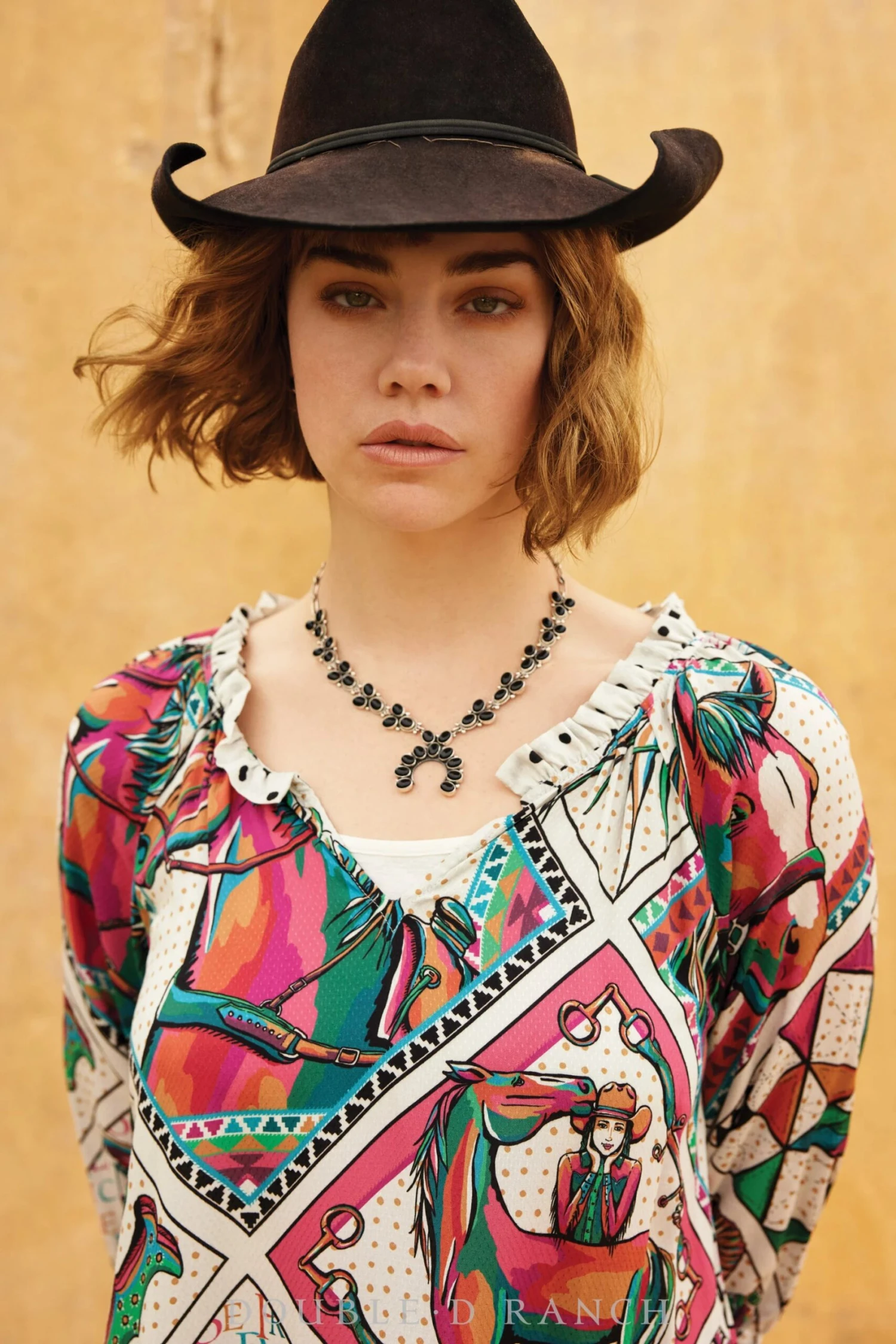 The hues are harmonious and feminine, bringing out the boldness of pink and orange complemented with turquoise and teals, tempered with accents of black and a canvas of white. The imagery is ranch-style Western meets egalitarian equine arranged in a classic quilt and trimmed with retro polka dot detail, with vintage vibes with a fresh feel. Effortless elegance.Â