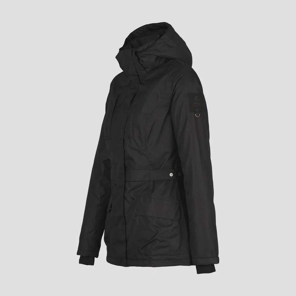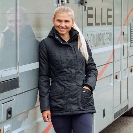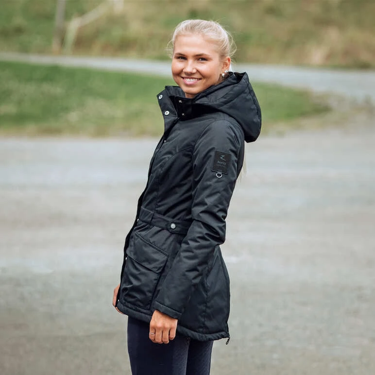 Our Jadine winter jacket is made from durable waterproof material. It is lightweight, but also warm. Breathable fabric keeps you well ventilated while riding. A zipper at the back ensures space when riding. The hood is detachable. Zipper pockets are perfect for your phone and keys.