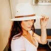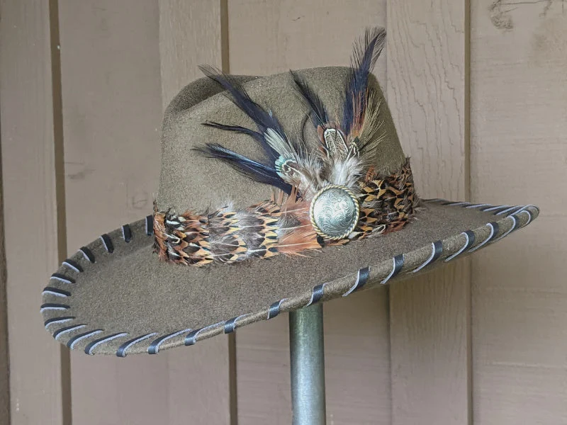 The Lanie felt hat is 100% wool and has a 3.75″ brim and 4.25″ crown. Hand laced in chocolate brown leather lace. Pheasant feather band and decorative navy blue, green and almond feathers with a large floral motif Concho completes the hat.Â