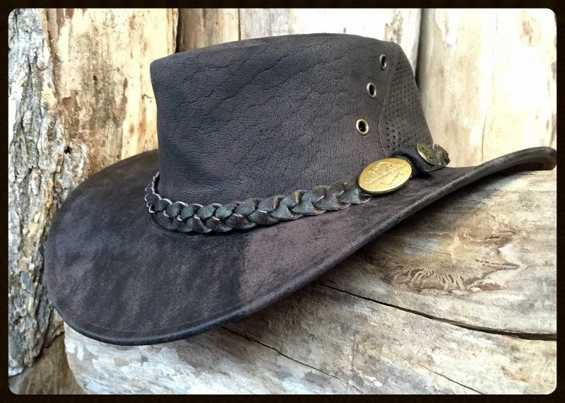 The Outback Survival gear Wellington Breeze is made of 100% Goat Leather. 100% waterproof. Crown venting holes. Rear venting. Braided fixed hat band. Coolmax Sweatband. Crushable and Shapeable.