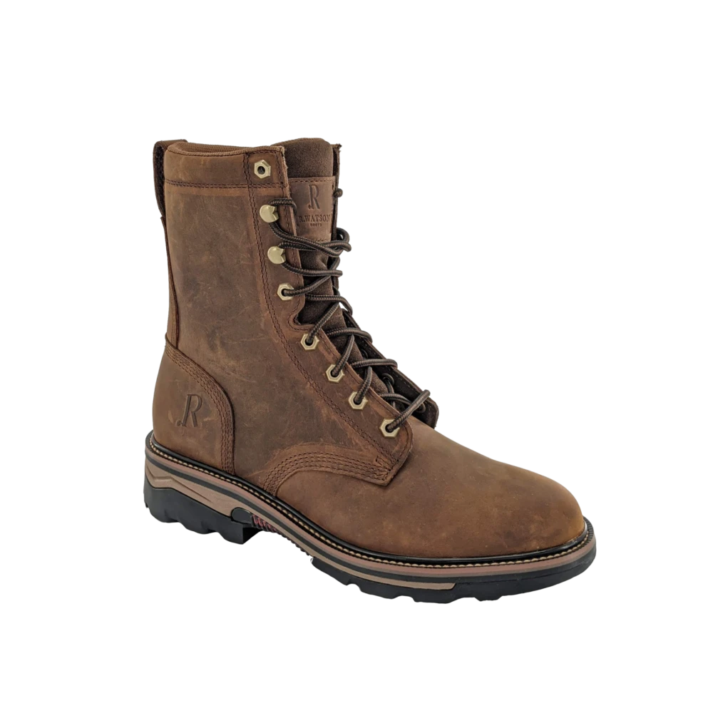 R. Watson presents these peanut cowhide and peanut cowhide lace up round toe work boots. These work boots have a removable orthotic insole, EVA midsole, and a block heel. They are EH, slip and oil resistant. 12″ total in height.