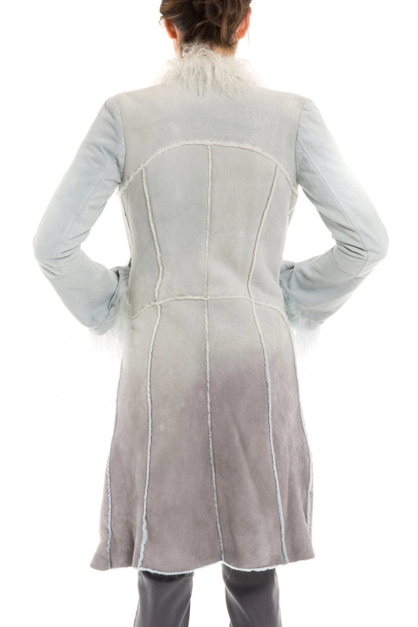 Made in Italy, this exceptional shearling jacket is created with 100% Tibetan lamb trimmed with whisper soft Curly Mongolian wool. Finished and hand dyed by artisans in tonal white to pale blue. Very light weight for extended season wearing. Two shearling lined hip pockets, accent shearling seams; sueded exterior finish. Hidden front tie leather cord closures.